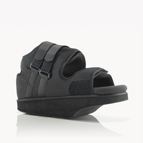 נעל אורתופדית לאחר ניתוח בעלת פתח לאצבעות וסולייה מרופדת ועמידה. הגבהה של 15 מעלות בחלקה הקדמי של הנעל להפחתת העומס על האצבעות ולהעברת הלחץ לאמצע כף הרגל ולעקב המרופד במיוחד.