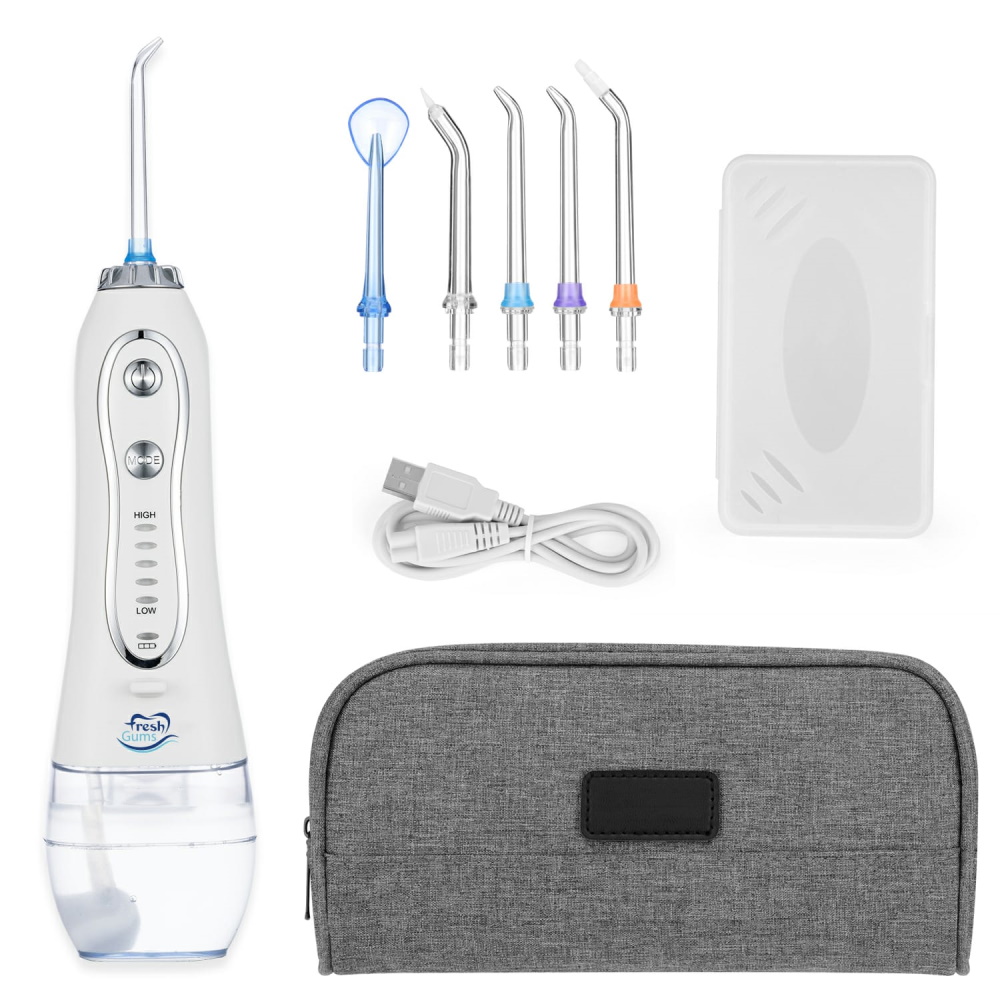 סילון מים דנטלי נטען מבית Fresh Gums להשלמת ניקוי השיניים והחניכיים. המוצר פועל עצמאית ללא צורך בחיבור לברז. למוצר 5 פיות מתחלפות: 1. זוג פיות לעיסוי החניכיים והסרת שאריות מזון. 2. פיה לניקוי גשרים אורתונטיים. 3. פיה לניקוי כתרים ושתלים. 4. פיה לניקוי ושטיפת הלשון. לבחירתך 5 רמות עומצה שונות לזרם המים. למוצר מיכל מים המכיל 300 מ”ל הכולל צינורית המאפשרת הזרמת מים בכל זוית!
