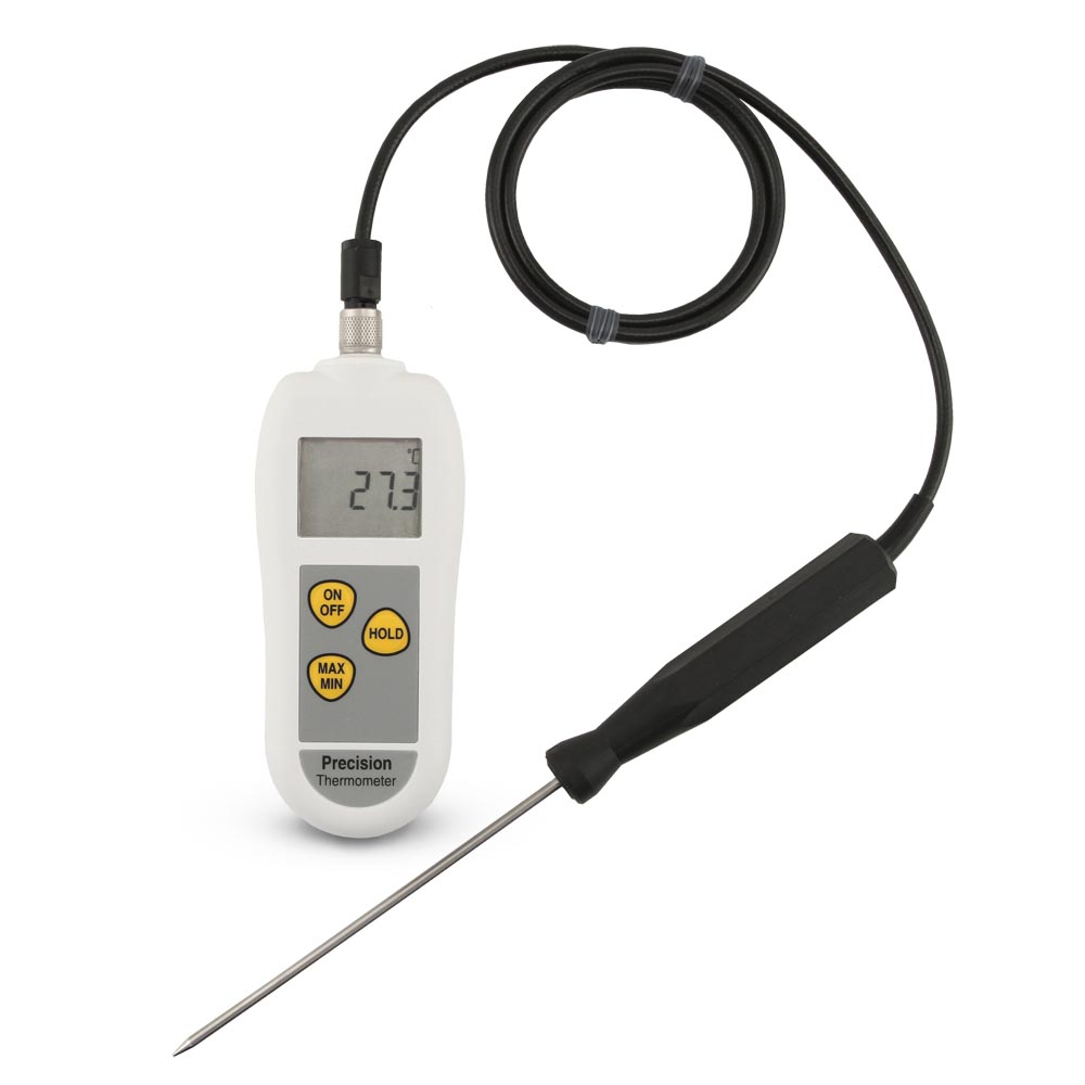 Precision Thermometer & Precision Plus PT100 thermometers. High accuracy is one of the notable features of the Precision thermometers. There are two models available, the Precision and Precision Plus. The Precision measures temperature over the range of 199.9 to 499.9 °C with a 0.1 °C resolution and high accuracy of ±0.2 °C. The Precision Plus measures temperature over the range of -199.99 to 199.99 °C with a 0.01 °C resolution and high accuracy of ±0.05 °C. Please note:- the accuracies quoted are for instruments only.