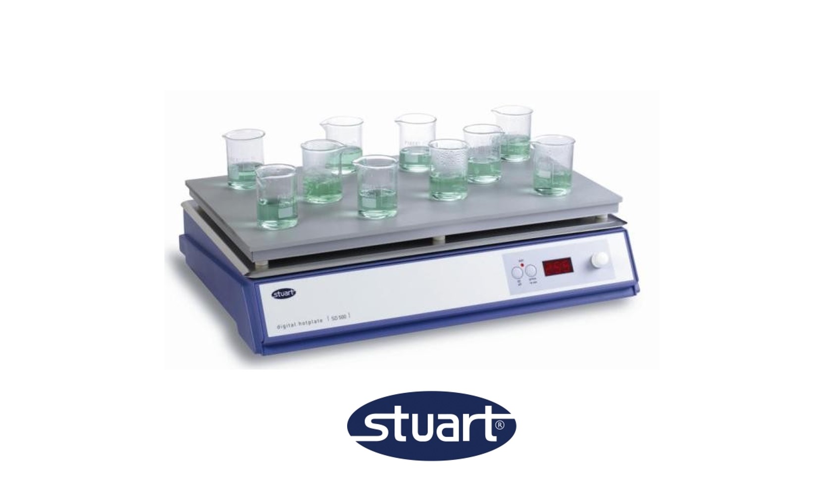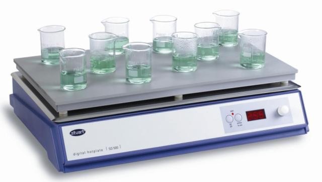 Metal top plate gives very even plate temperature and uniform heating conditions. Hotplate with microprocessor control for accurate monitoring of the plate temperature. Large capacity to accommodate multiple vessels or microscope slides.