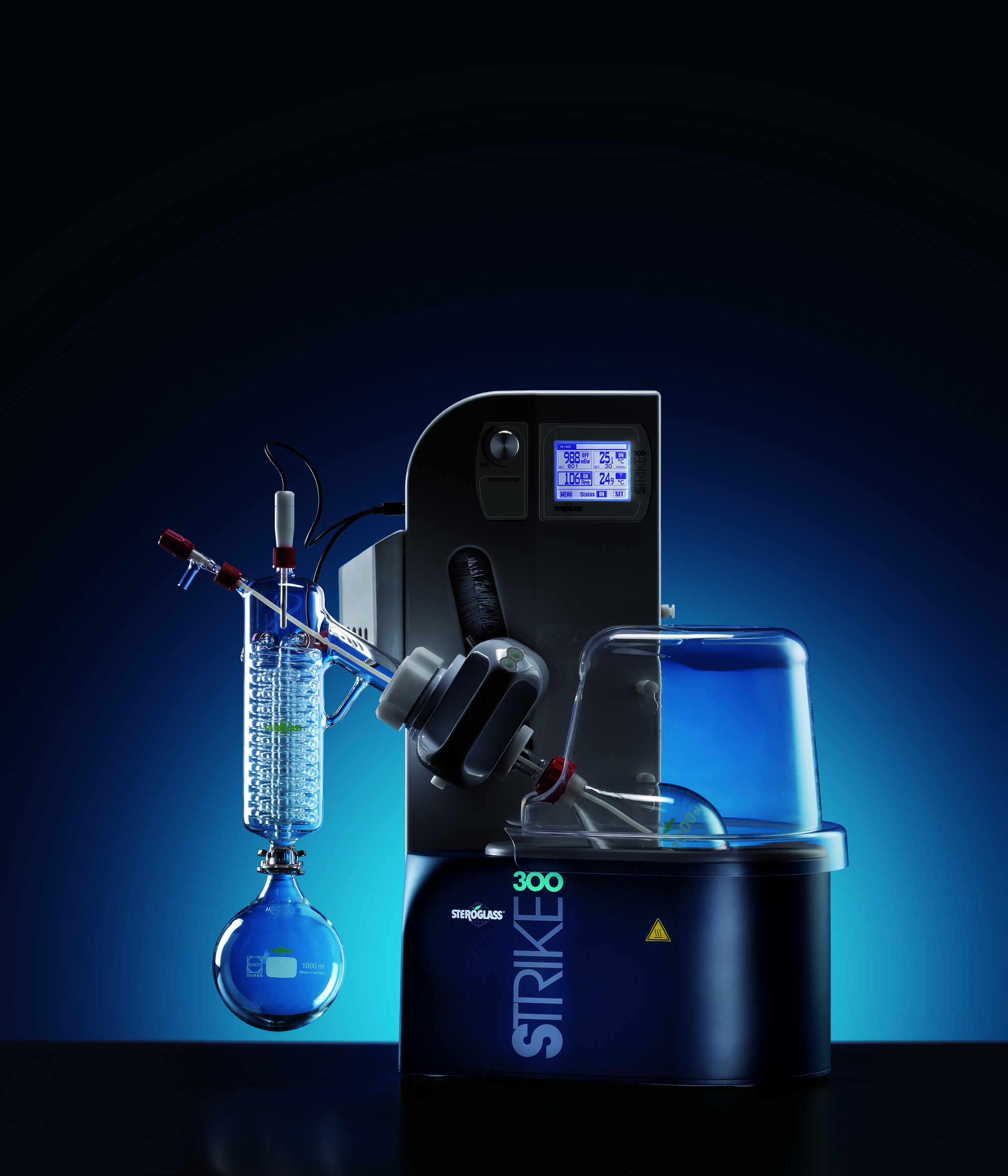 It has been designed keeping in mind the dual purpose of obtaining a completely safe instrument as well as performance optimization. The transparent protective shield provides both the user and working environment with maximum protection from moving and heated parts during all operating stages.No maintenance needed in the mechanical sealing system, which guarantees constantly vacuum tight seal. The microprocessor equipped with an LCD interface and touch screen can be multi-programmed so that the user can always control and modify all the parameters needed. Strike 300 is provided with GLP system (Good Laboratory Practice). An automatic mechanical device lifts the glassware-motor group and a vacuum controller and/or the temperature probe can be connected to the instrument.