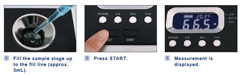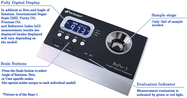 Announcing an All-in-One, refractometer and polarimeter hybrid unit. As little as 3mL sample, Repo-1 can measure both brix and optical rotation of the sample. With the press of a button, purity, international sugar scale, specific rotation, and concentration can be displayed. Users can also set an upper and lower measurement limit. An indicator light alerts the user if a measurement value is within the limits, allowing for optimal efficiency.