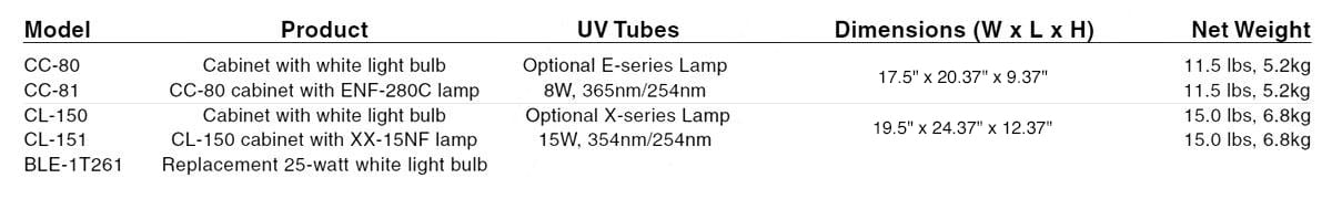 CC-80 cabinets accommodate our E-series lamps (8-watt, single or double tube models), whereas CL-150 cabinets accommodate our X-series lamps (15-watt, single or double tube models). The spacious CC-80 cabinet accepts standard gels and up to two 8” x 8” (20 x 20cm) TLC plates, while the even roomier CL-150 can easily accommodate larger gels and up to four 8” x 8” plates.