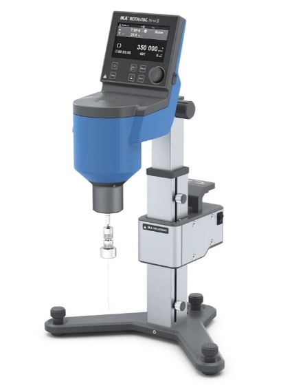 The motorized IKA HELISTAND moves the mounted viscometer and its rotating body slowly and uniformly up and down in the sample