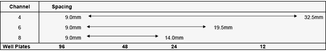 Gel Loading Easily aspirate 8 or 12 samples from a 9.0mm spacing 96 well PCR plate and dispense to 4.5mm spacing gel lanes.