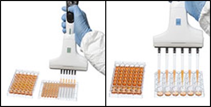Cell Seeding 4, 6 and 8 channel VOYAGER pipettes allow cell seeding to 12, 24, 48 and 96 well plates. Simply set the center to center well spacing and toggle between two or three different spacings with the touch of the wheel. |